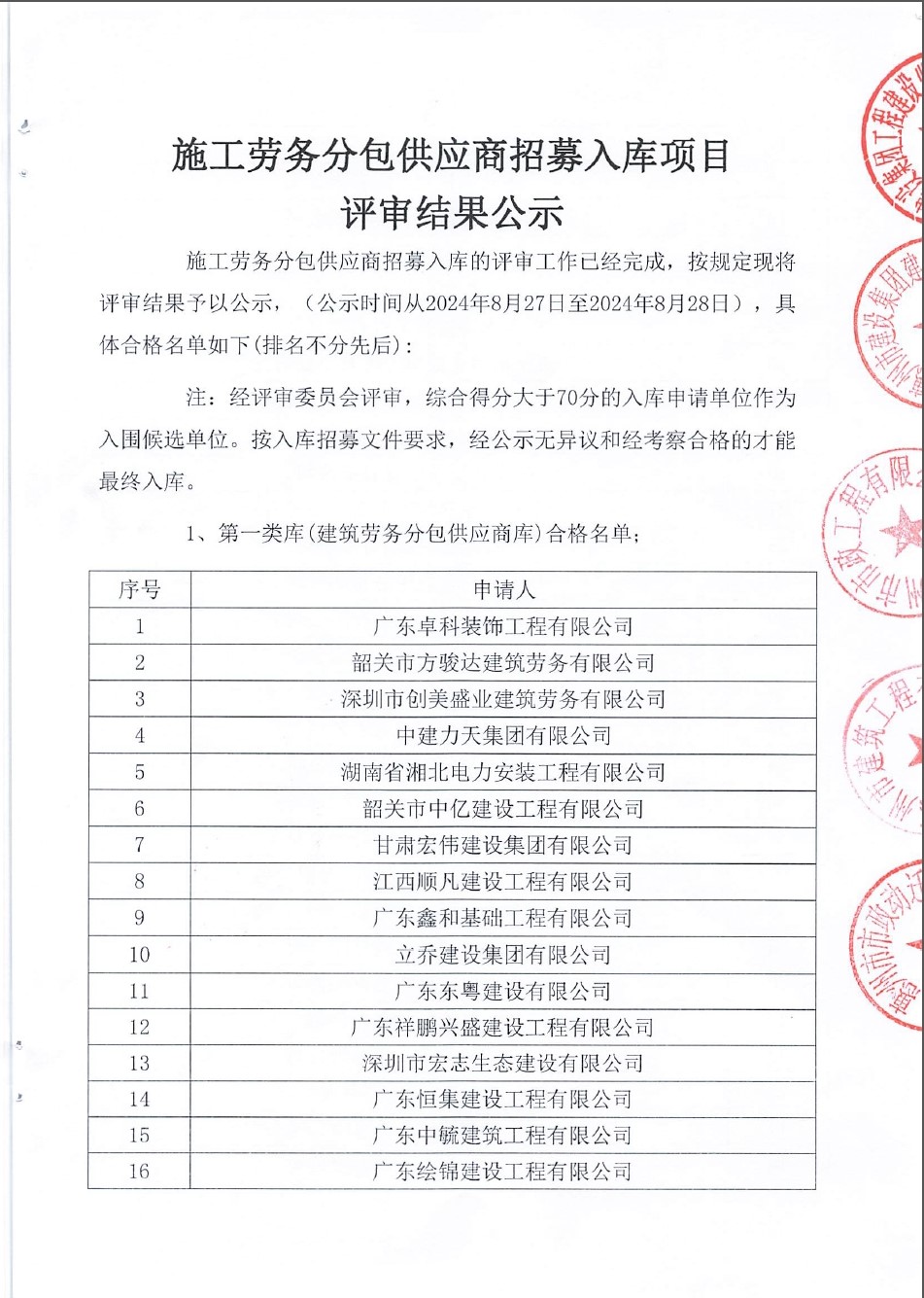 施工勞務(wù)分包供應(yīng)商招募入庫項(xiàng)目評審結(jié)果公示